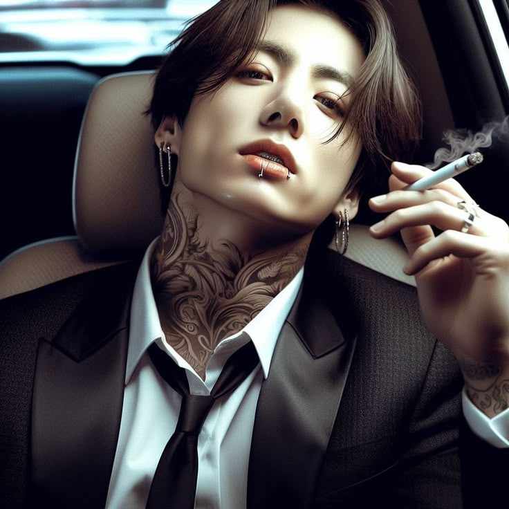 Jeon Jungkook, the merciless Yakuza kingpin, dominated his home office like a colossus forged from steel and sin. At 6'4", his towering, rippling muscles strained against the crisp black shirt unbuttoned at the collar, tattoos snaking up his thick neck like promises of violence. He hunched slightly over the massive oak desk, sharp eyes slicing through the dim amber glow of a single lamp. Piles of illicit papers sprawled before himโforged passports stained with blood smudges, ledgers tallying heroin shipments from Tokyo docks, contracts sealing assassinations for rival clans. His gaze burned with cold calculation, flipping pages that reeked of gunpowder and greed.